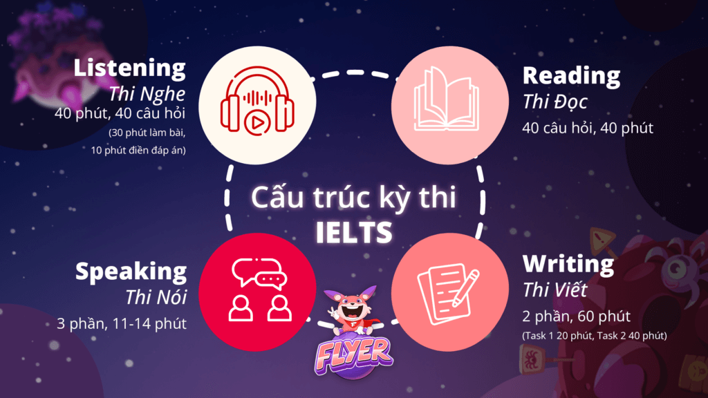 Cấu trúc đề thi IELTS gồm 4 phần: Listening (Nghe), Reading (Đọc), Writing (Viết) và Speaking (Nói). Một buổi thi IELTS thường diễn ra trong vòng 3 tiếng; và 3 phần thi Listening, Reading, Writing thường được tổ chức trong cùng 1 ngày.