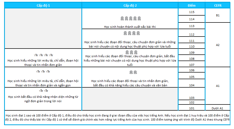 Cụ thể, số sao/huy hiệu mà một thí sinh đạt được cho biết khả năng tiếng Anh hiện tại của em, và đưa ra những khuyến nghị về lộ trình học tập tiếng Anh sắp tới của em.