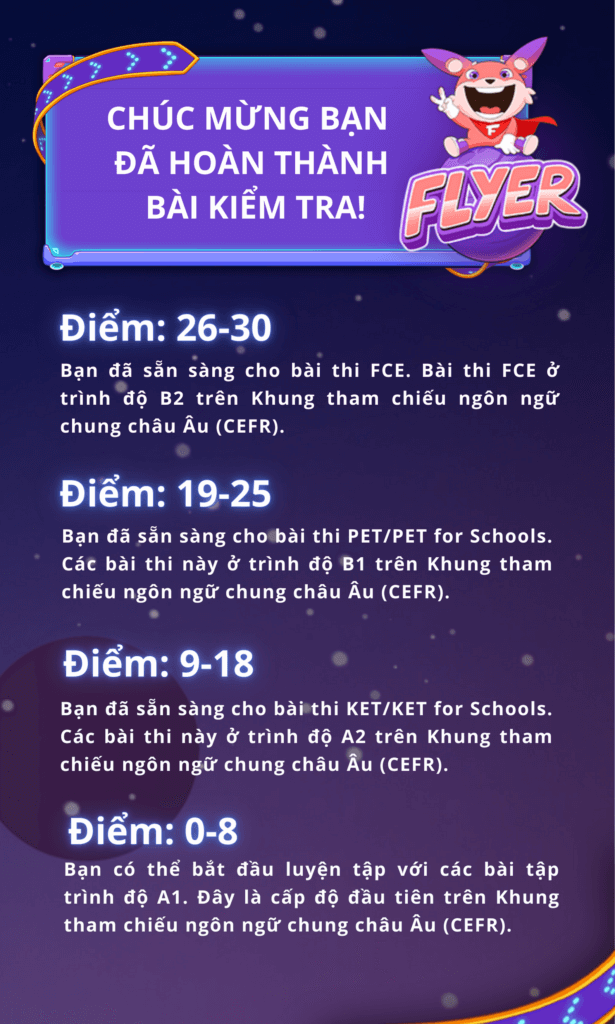 Dựa vào kết quả đạt được, bạn có thể biết mình đủ khả năng tiếng Anh để ôn thi bài thi Cambridge cấp độ nào (A2 KET, B1 PET, B2 FCE, C1 CAE hay C2 CPE) trên Khung năng lực ngôn ngữ chung châu Âu (CEFR).
