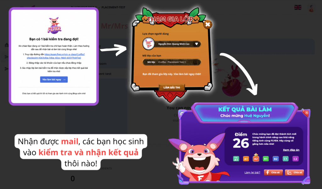 Và vậy là xong! Với cách 1, học sinh sẽ nhấn vào đường link và trực tiếp làm bài tại nhà trên máy tính hoặc máy tính bảng. Còn với cách 2, hệ thống FLYER sẽ tự động gửi lời mời tham gia kiểm tra trình độ đầu vào qua email cho học sinh/ phụ huynh. Khi đó, học sinh cũng chỉ cần nhấn vào đường link đề kiểm tra để làm bài.