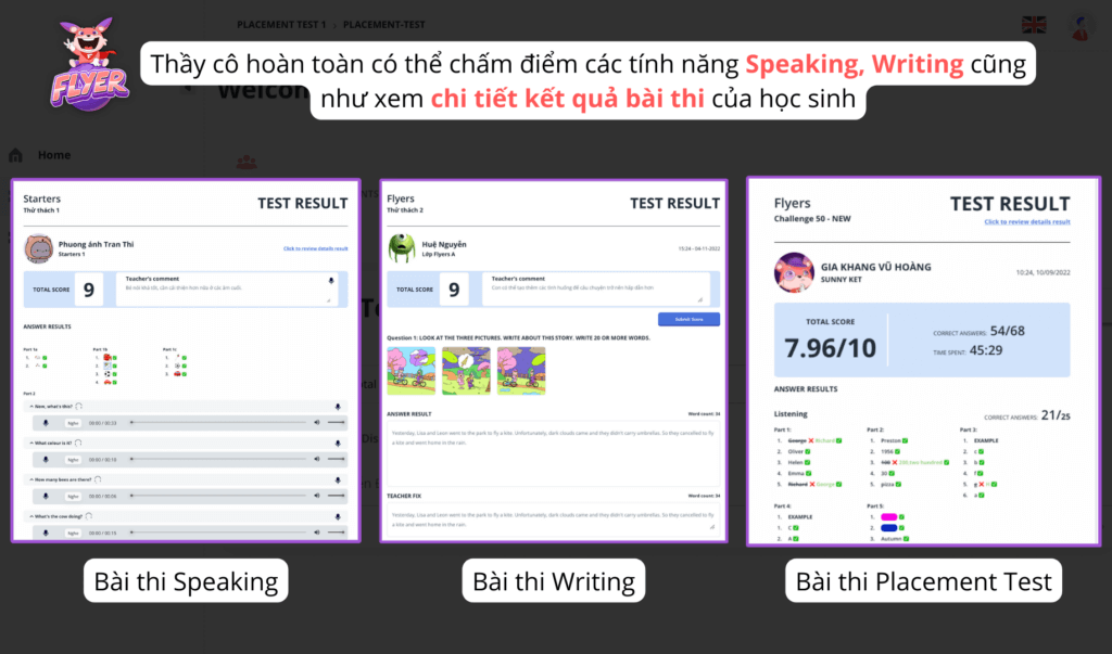 Tính năng này tiện lợi cho trung tâm, trường học và thầy/ cô hơn cả khi hệ thống FLYER sẽ ngay lập tức trả điểm và đánh giá chính xác trình độ tiếng Anh của học sinh theo hệ đánh giá quốc tế (từ Pre A1 – C2) sau khi các con hoàn thành bài. Thầy/ cô không cần phải tốn thời gian chấm bài cho từng học sinh nữa.