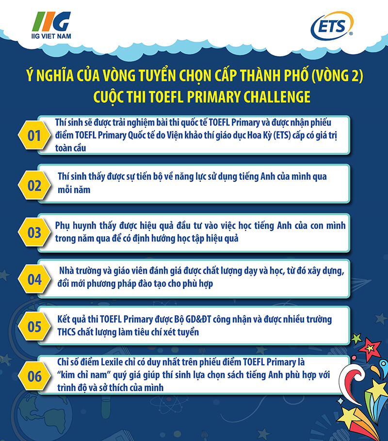 Cuộc thi tiếng anh TOEFL Primary Challenge và TOEFL Junior Challenge được tổ chức bởi IIG Việt Nam, đại diện chính thức và duy nhất của Viện Khảo thí Giáo dục Hoa Kỳ (ETS) tại Việt Nam, Lào, Campuchia và Myanmar.
