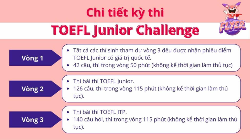 | Nội dung | Tất cả các thí sinh tham dự vòng 3 đều được nhận phiếu điểm TOEFL Junior có giá trị quốc tế do Viện Khảo thí Giáo dục Hoa Kỳ (ETS) cấp. |