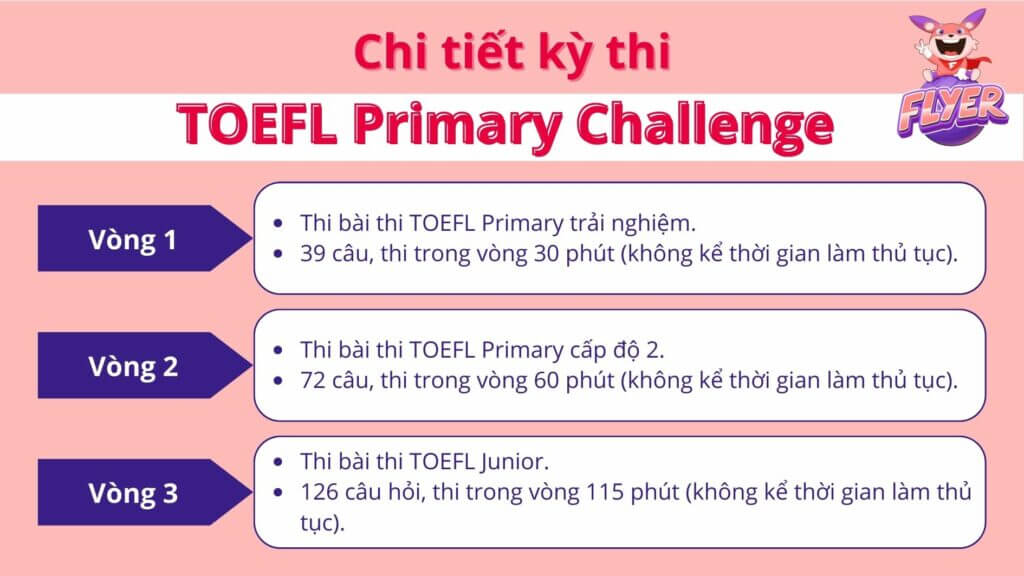 Cuộc thi TOEFL Primary Challenge và TOEFL Junior Challenge được tổ chức thành 3 vòng với ngày diễn ra từng vòng thi hàng năm được IIG thông báo cụ thể trên website chính thức của tổ chức.