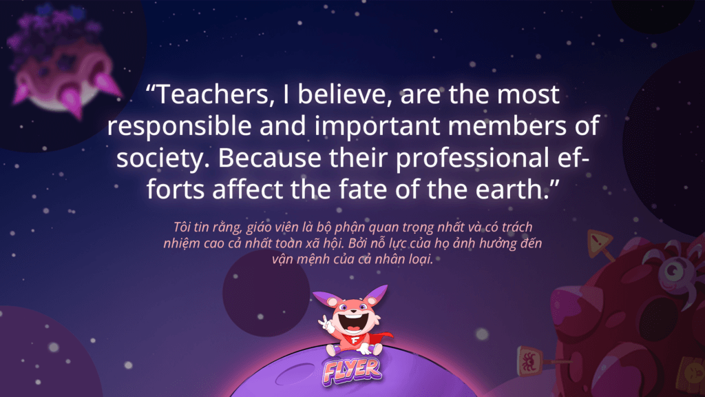 Hy vọng qua bài viết trên, bạn đã hiểu rõ hơn về nghề giáo viên dạy tiếng Anh; cũng như biết được lộ trình trở thành một giáo viên tiếng Anh một cách chi tiết và rõ ràng. Bạn cần thường xuyên học tập, trau dồi bản thân; rèn luyện tiếng Anh và học hỏi từ những người xung quanh để “nâng cấp” bản thân hơn. “Có công mài sắt, có ngày nên kim”, FLYER xin chúc bạn thành công trên con đường giáo dục ngoại ngữ của mình!