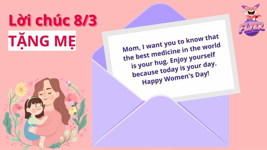 | 10 | Mom, I want you to know that the best medicine in the world is your hug. Enjoy yourself because today is your day. Happy Women’s Day! | Mẹ ơi, con muốn mẹ biết rằng liều thuốc tốt nhất trên thế giới này chính là cái ôm của mẹ. Mẹ hãy tận hưởng chính mình vì hôm nay là ngày của mẹ. Chúc mẹ ngày Phụ nữ vui vẻ! |