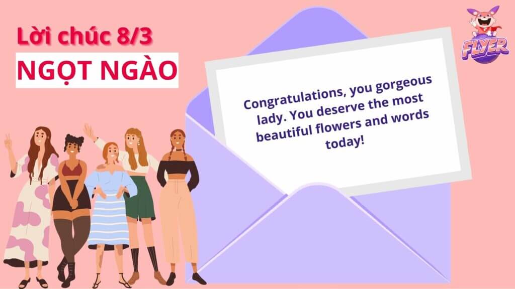 Trong bài viết này, FLYER sẽ gợi ý cho bạn 60+ lời chúc 8/3 bằng tiếng Anh siêu ý nghĩa dành riêng cho từng nhóm phái nữ khác nhau như mẹ, bà, người yêu/ vợ, chị em gái hay bạn bè phái nữ,… Bên cạnh những bó hoa hay món quà xinh xắn, những lời chúc ngọt ngào và đầy ý nghĩa cũng đặc biệt quan trọng bởi chúng có thể khiến “một nửa thế giới” hạnh phúc từ tận đáy lòng, nhờ đó tình cảm đôi bên cũng thêm phần khắng khít hơn.