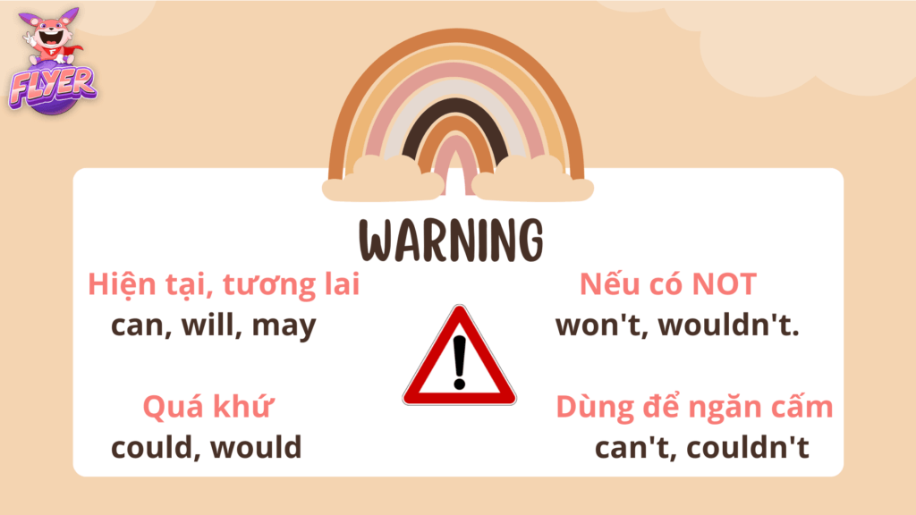 - Nếu có NOT trong câu, “won’t/ wouldn’t” mang nghĩa phủ định thông thường trong khi “can’t/ couldn’t” dùng với mục đích ngăn cấm, cấm cản điều gì đó.