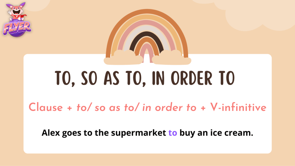 - “To” thường được sử dụng ở dạng khẳng định trong mệnh đề chỉ mục đích. Mặc dù “not to + V” vẫn đúng về mặt ngữ pháp nhưng FLYER không khuyến khích bạn sử dụng cách nói này trong mệnh đề chỉ mục đích.