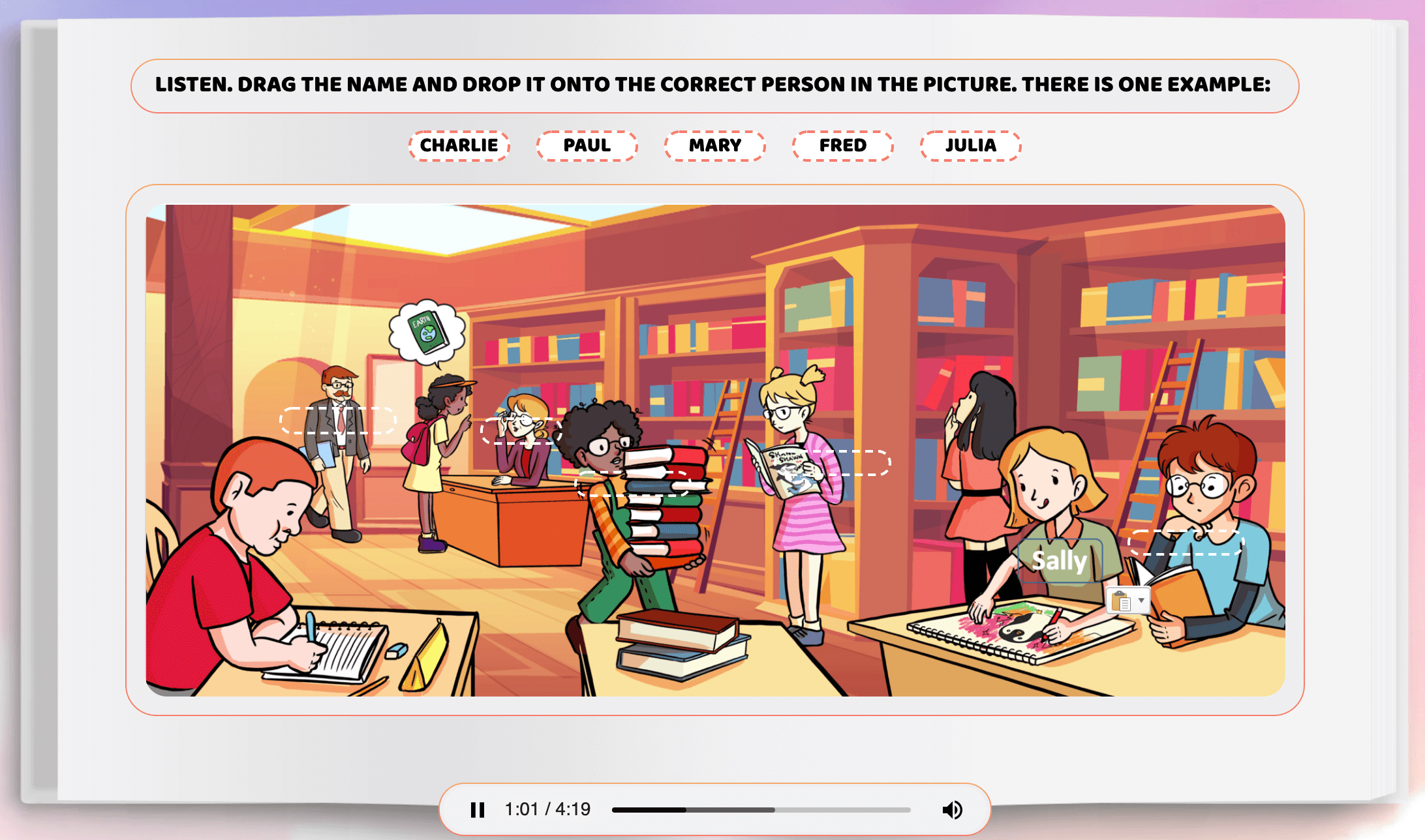 | 1 | Xem một bức tranh và nghe một cuộc đối thoại, nối tên nhân vật cho sẵn với người được nhắc đến tương ứng trong tranh. |