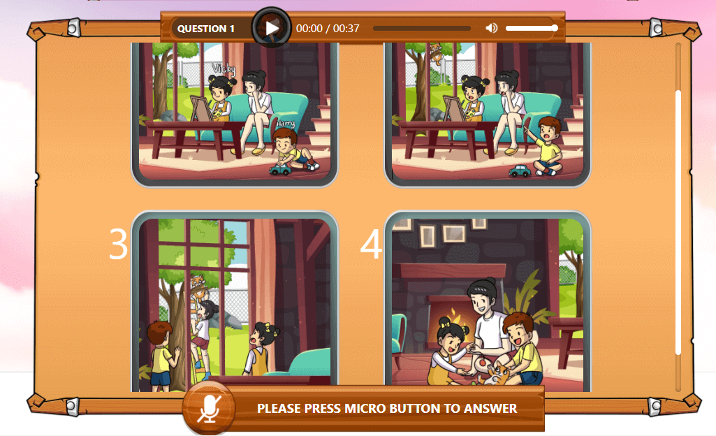 | 2 | Xem loạt 4 bức tranh mà khi sắp xếp đúng thứ tự, chúng kể lại một câu chuyện. Giám khảo mô tả cho thí sinh bức tranh đầu tiên, sau đó đề nghị thí sinh mô tả 3 tranh còn lại. |