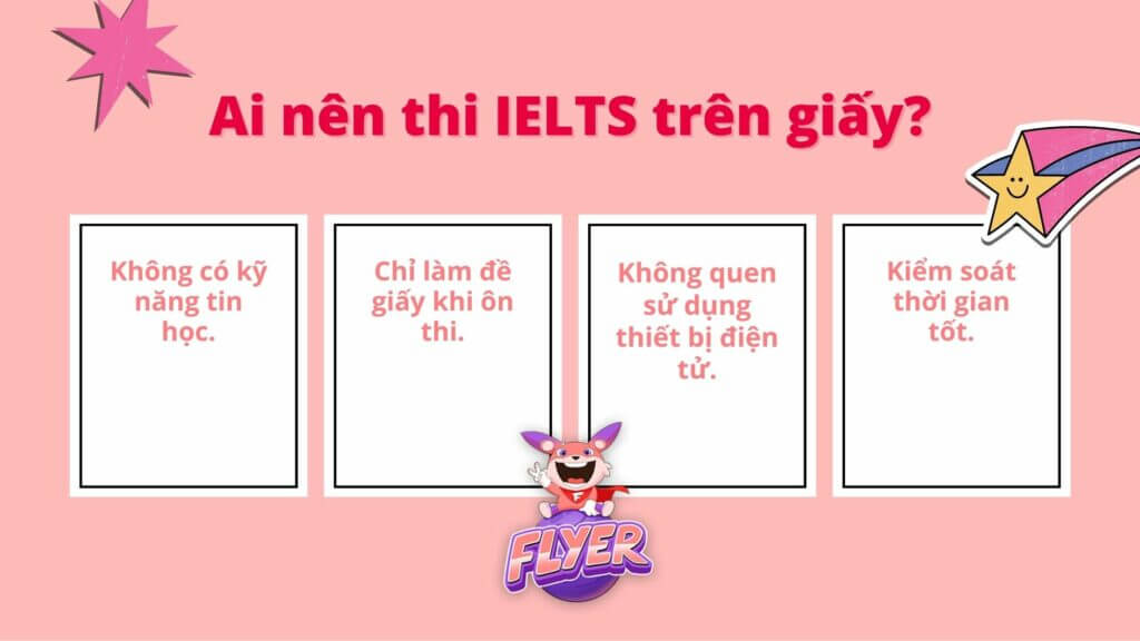 Quyết định nên thi IELTS trên giấy hay máy tính là bước đầu tiên để các sĩ tử vạch ra lộ trình ôn luyện đúng đắn. Đối với thí sinh đã có kỹ năng máy tính cơ bản và có ít thời gian rảnh, thi IELTS trên máy tính là sự lựa chọn đáng cân nhắc. Ngược lại, thí sinh ở các thành phố lớn có ưu thế trong việc di chuyển đến điểm thi và dư dả thời gian hơn thì phù hợp với thi trên giấy. Hãy cùng FLYER xem xét các ưu, nhược điểm của 2 hình thức thi IELTS và ra quyết định phù hợp nhé.