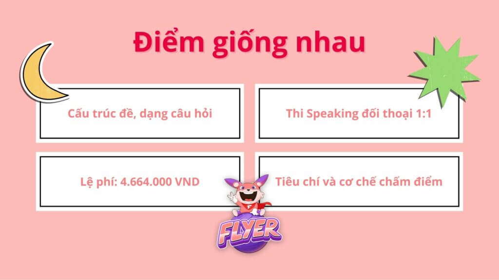 | Phân bổ thời gian thi | Thi Nghe – Đọc – Viết trong cùng 1 ngày và thi Nói vào ngày khác | Có thể thi 4 kỹ năng trong cùng 1 ngày |