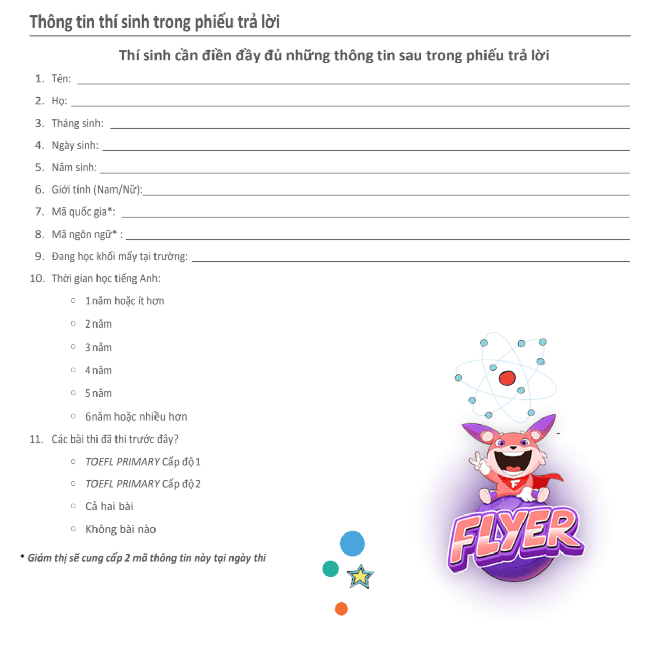 Đầu tiên, trong ngày thi TOEFL Primary thực tế diễn ra, thí sinh cần điền một số thông tin cá nhân trong phiếu trả lời. Các thông tin thí sinh cần cung cấp bao gồm những thông tin trong bảng dưới đây: