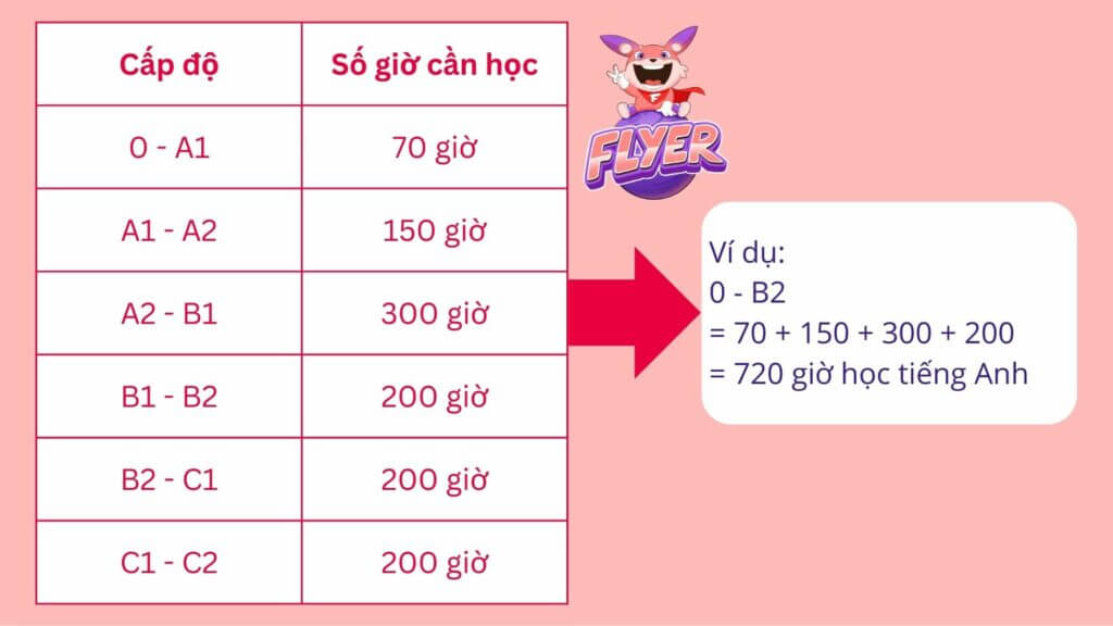 -> Để có thể từ “con số 0” lên cấp độ B2, bạn cần 70 + 150 + 300 + 200 = 720 giờ học tiếng Anh.