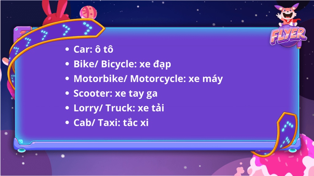Phương tiện đi lại là chủ đề vô cùng quen thuộc, thường xuyên xuất hiện trong các cuộc giao tiếp, đối thoại hàng ngày. Việc nắm vững các từ vựng căn bản về phương tiện giao thông và cách hỏi đường bằng tiếng Anh sẽ cực kỳ hữu ích cho các bạn khi mới bắt đầu học tiếng hay có ý định đi du lịch, du học nước ngoài. Cùng FLYER khám phá tất tần tật về phương tiện đi lại phổ biến nhất trong tiếng Anh trong bài viết dưới đây nhé!