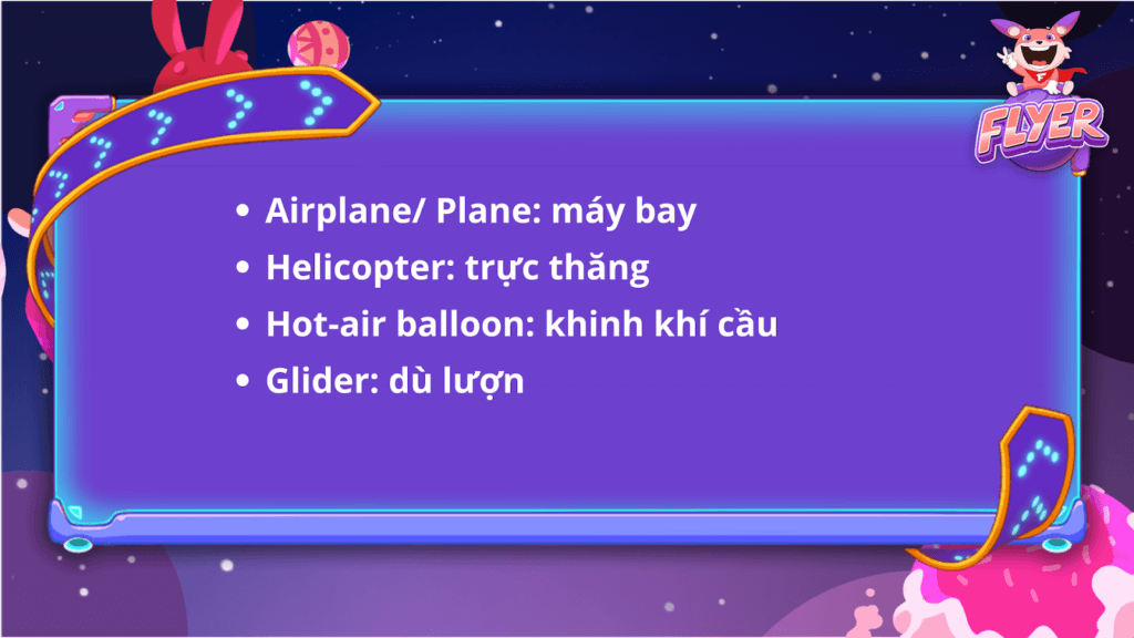 Hot-air balloon/hɒtˈeə bəˌluːn/khinh khí cầuThe hot-air balloon flies depending on the wind direction.