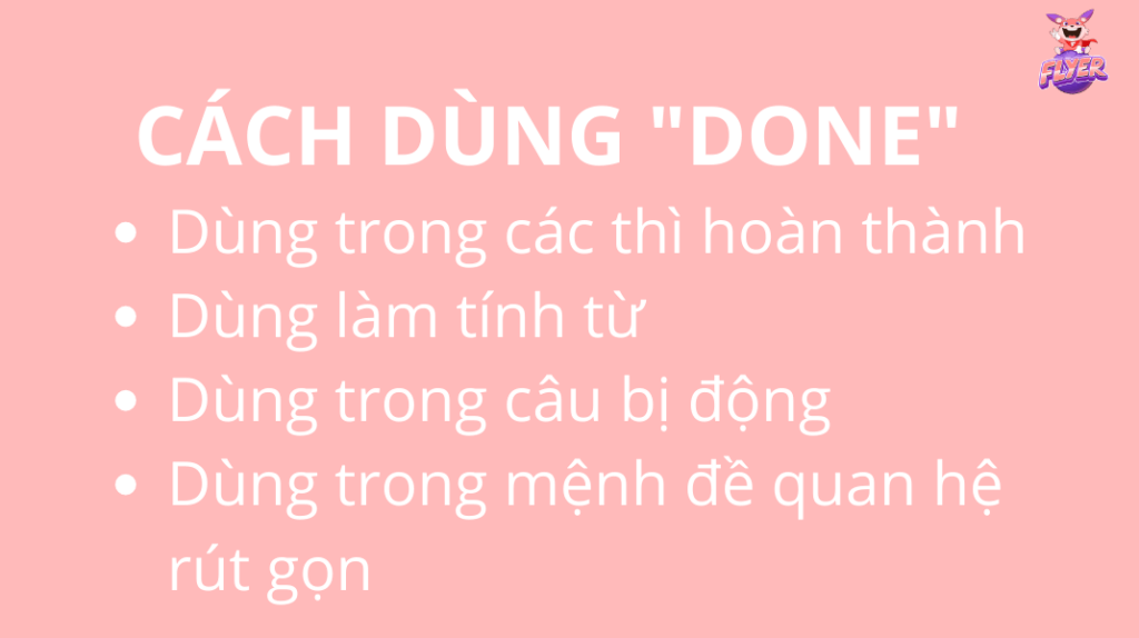 “Done” là quá khứ phân từ của “do”, thường được sử dụng trong câu bị động, mệnh đề quan hệ rút gọn và trong vai trò là tính từ. Ngoài ra, “done” còn được sử dụng trong các thì hoàn thành như hiện tại hoàn thành, quá khứ hoàn thànhtương lai hoàn thành. Trong các trường hợp này, “done” mang nghĩa là “đã xong”, “đã hoàn thành”.