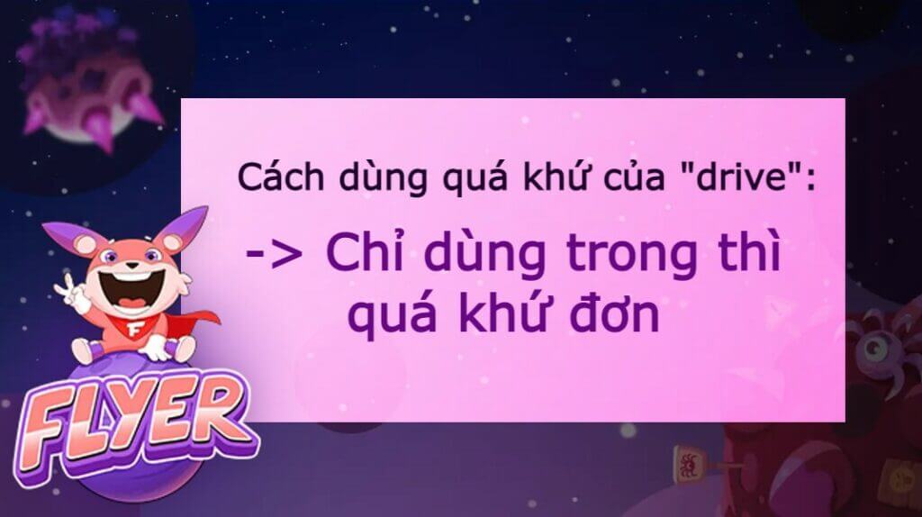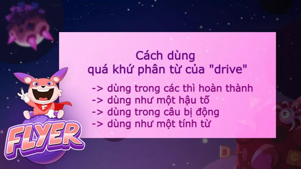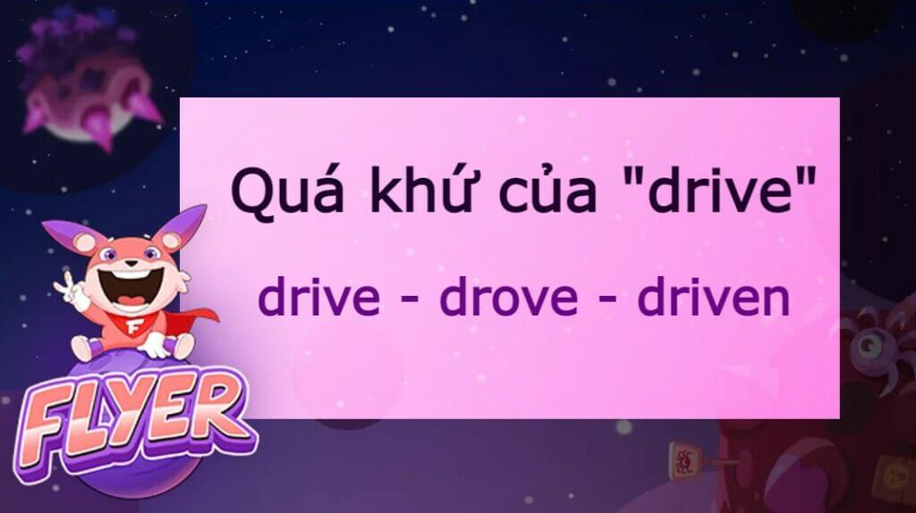 “Drive” có dạng quá khứ đơn là “drove” (quá khứ cột 2 “V2”)  và quá khứ phân từ là “driven” (quá khứ cột 3 “V3”).