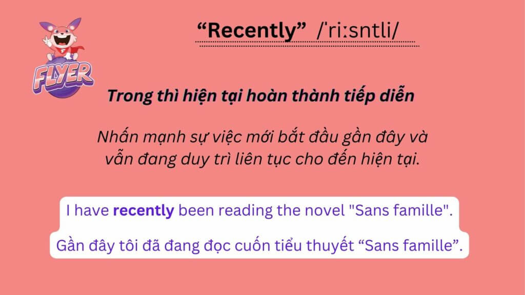 Tương tự như với thì hiện tại hoàn thành, “recently” cũng là một trong những dấu hiệu nhận biết của thì hiện tại hoàn thành tiếp diễn. Thì hiện tại hoàn thành tiếp diễn dùng để diễn tả một hành động mới bắt đầu gần đây trong quá khứ và vẫn đang duy trì liên tục cho đến hiện tại.