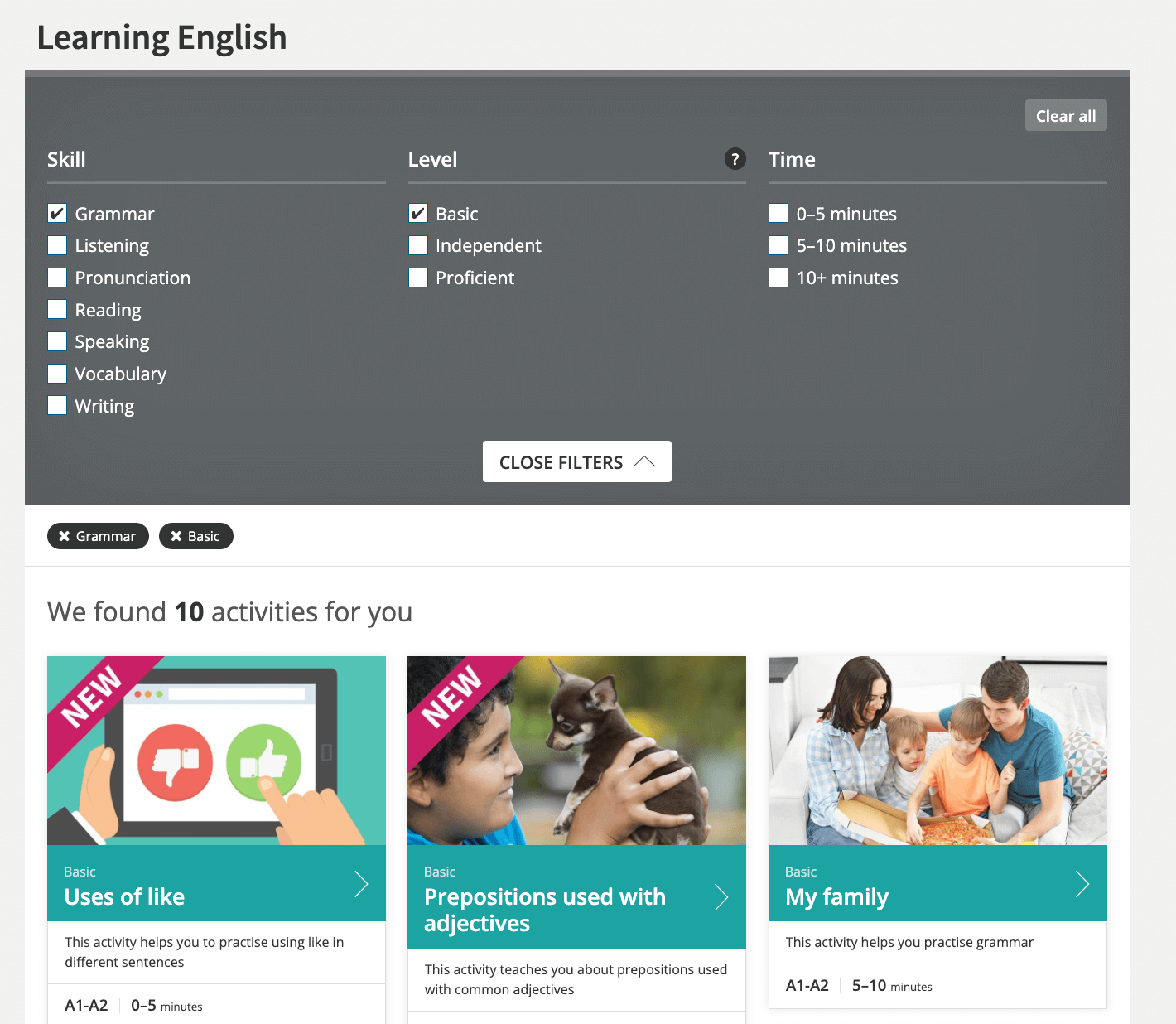 A2 Key hay KET của Cambridge là bài thi tiếng Anh ở mức căn bản (Basic/Elementary). Khi chọn bài tập ngữ pháp trong kho bài ôn thi của Cambridge, bạn lưu ý chọn mức độ bài luyện tập Basic trong cột Level. Thời lượng làm bài 0-5 phút, 5-10 phút hoặc nhiều hơn 10 phút phù hợp với quỹ thời gian ôn tập của bạn.