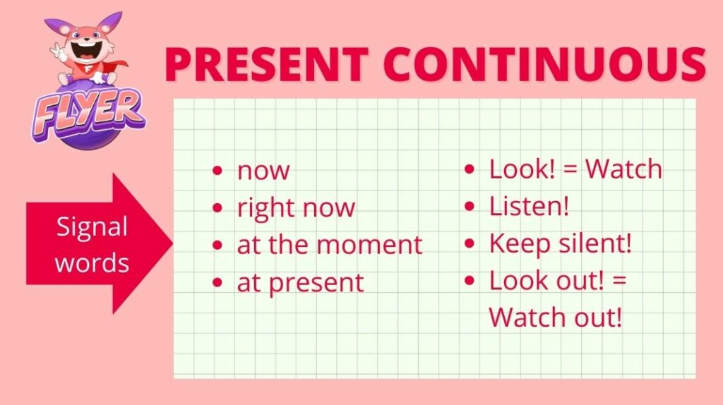 Thì hiện tại tiếp diễn thường đi cùng những trạng từ sau: now, right now, at the moment, at present, it’s + giờ cụ thể + now,… hoặc sau các câu lệnh như “Look!/ Watch!/…”.