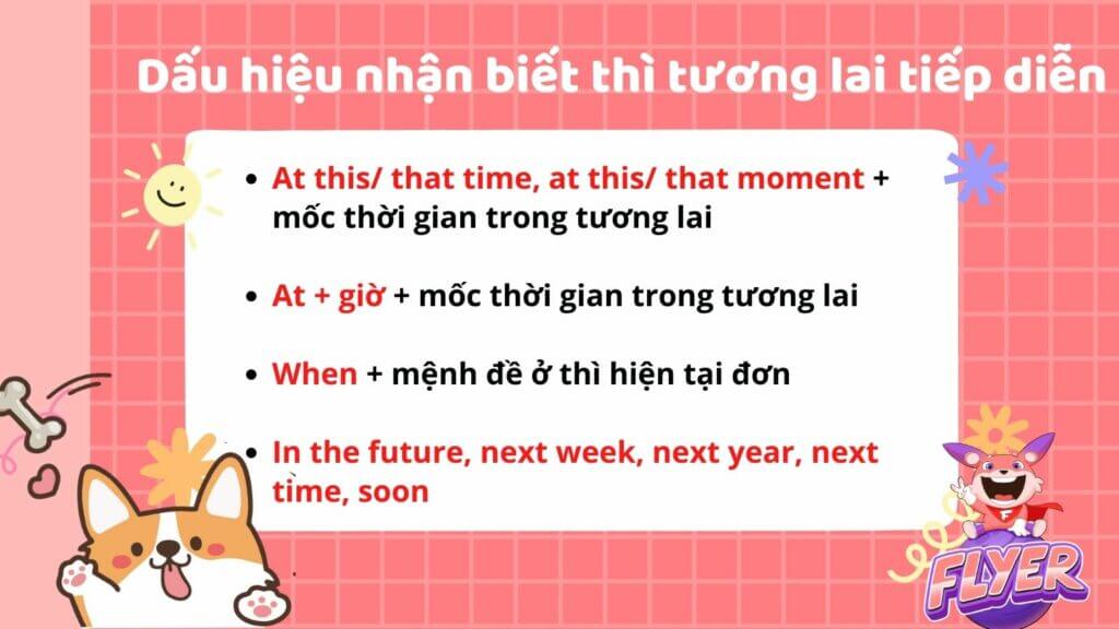 Dấu hiệu nhận biết rất quan trọng, đặc biệt là trong các bài thi, các bạn cần phải xác định rõ các dấu hiệu này để làm bài hiệu quả. Thì tương lai tiếp diễn được nhận biết khi trong câu có các cụm từ sau: