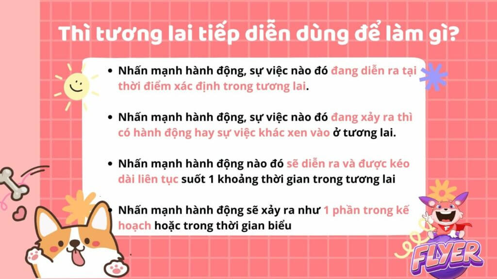 Thì tương lai tiếp diễn có các cách dùng như sau: