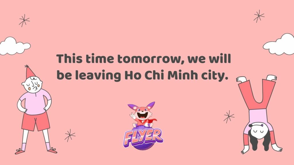 | 1. Nhấn mạnh một hành động hay sự việc nào đó đang diễn ra tại một thời điểm xác định trong tương lai: | – This time tomorrow, we will be leaving Ho Chi Minh city. (Giờ này ngày mai, chúng tôi sẽ rời khỏi thành phố Hồ Chí Minh.) -> Trong câu này, thì tương lai tiếp diễn được dùng để diễn tả hành động “rời khỏi thành phố HCM” vào một thời điểm xác định trong tương lai là “giờ này ngày mai”. – Tonight at 8 PM, I will be having fun at Jane’s birthday party. (Tối nay lúc 8 giờ, mình sẽ có thời gian vui vẻ tại bữa tiệc sinh nhật của Jane.) -> Thì tương lai tiếp diễn dùng trong câu này để diễn tả sự việc “vui vẻ tại bữa tiệc sinh nhật của Jane” vào một thời điểm xác định là “tối nay lúc 8 giờ”. |