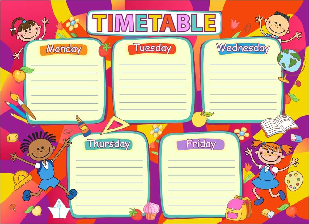 Có rất nhiều mẫu thời khóa biểu tiếng Anh mà trẻ có thể sử dụng, ba mẹ và các bé có thể tham khảo một số mẫu thời khóa biểu dưới đây: