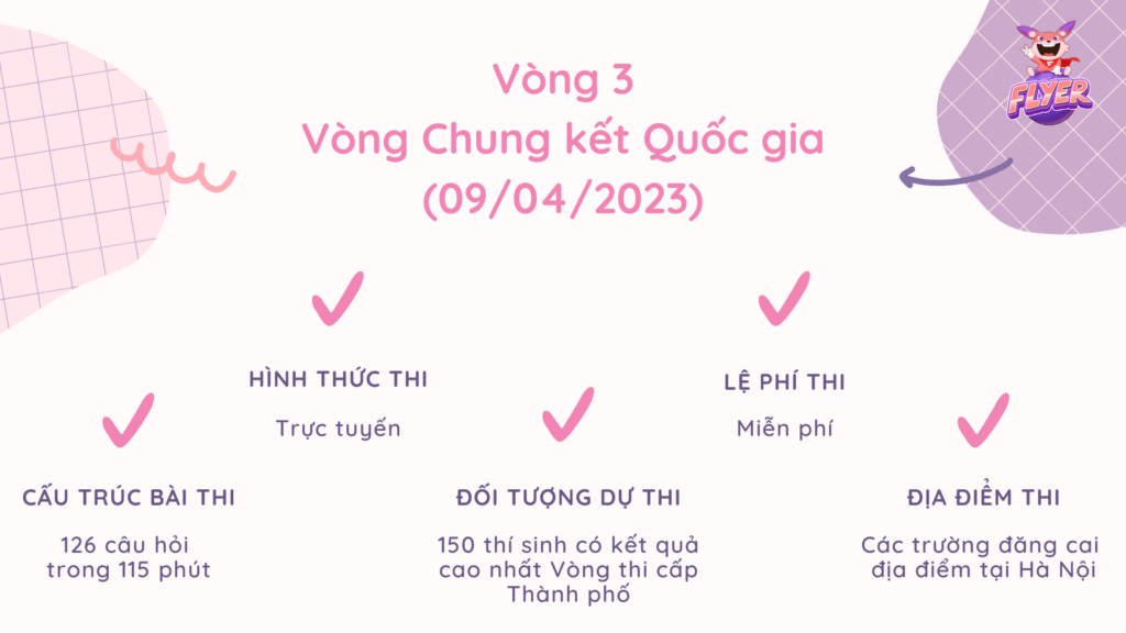 | Nghệ An | Vòng 1 – Vòng Trải nghiệm trực tuyến miễn phí: Lịch thi: Từ 08-12/02/2023 Hạn đăng ký: 14/01/2023 Vòng 2 – Vòng thi cấp Thành phố: Lịch thi: 05/03/2023 Hạn đăng ký: 15/02/2023 Vòng 3 – Vòng chung kết quốc gia: Ngày thi: 09/04/2023 | Đăng ký trực tuyến tại đây. |