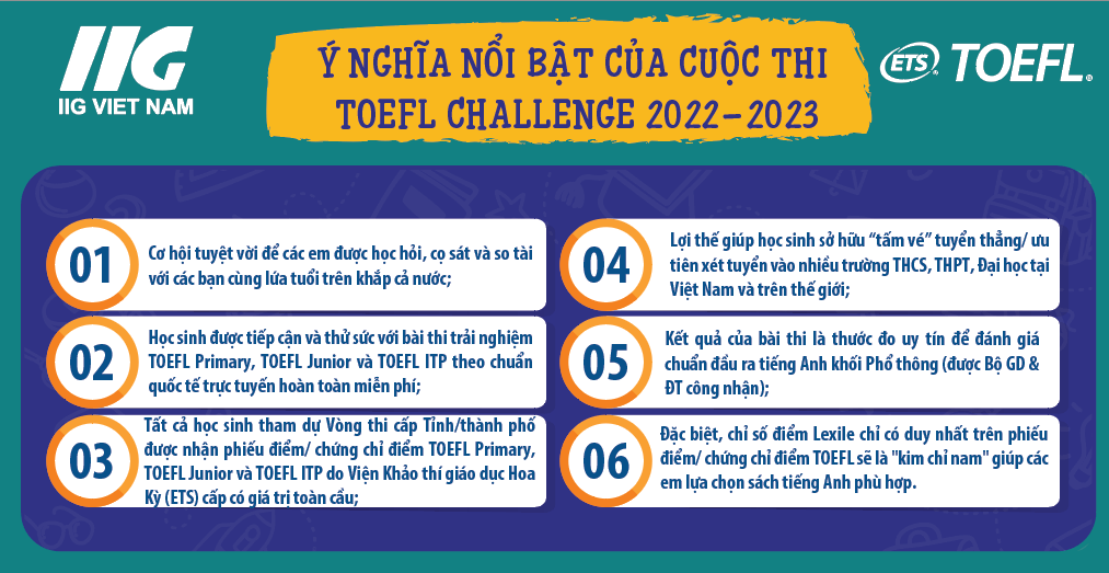Với hơn 10 năm bền bỉ triển khai và không ngừng đổi mới, TOEFL Challenge ngày càng khẳng định là một sân chơi tiếng Anh uy tín với quy mô lớn nhất cả nước, được các Sở Giáo dục và Đào tạo quan tâm phối hợp tổ chức thường niên và luôn được đông đảo các bậc phụ huynh, các em học sinh đón chờ hàng năm. Cuộc thi là cơ hội rất tốt để các em học sinh được tiếp cận với chuẩn đánh giá quốc tế danh tiếng, qua đó có lộ trình học tập, rèn luyện chính xác để vững tin trở thành những công dân toàn cầu trong tương lai.