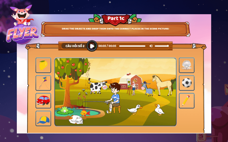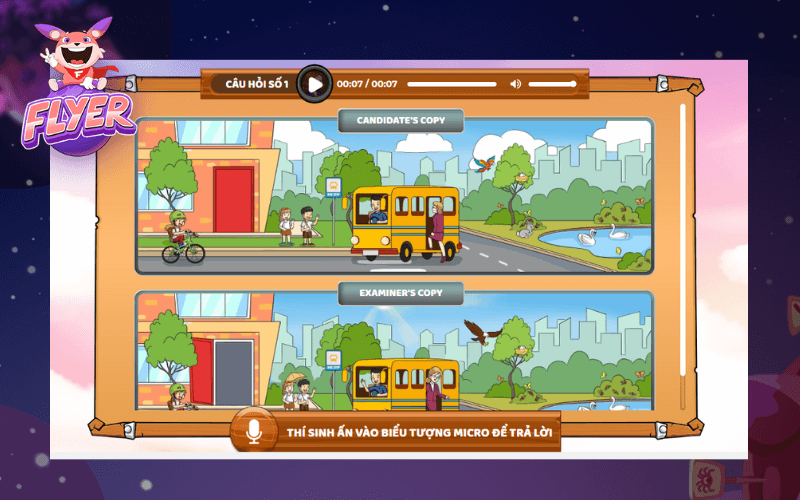 Với bài thi nói, học sinh sẽ được nghe audio với giọng giáo viên bản ngữ Anh – Mỹ ghi âm câu trả lời trực tiếp trong bài thi. Chỉ cần truy cập vào phòng thi ảo trên điện thoại, máy tính bảng hoặc máy tính bàn, trẻ đã có thể ôn luyện thoả thích trong kho đề thi thử khổng lồ từ FLYER.