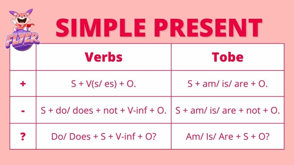 | Nghi vấn | Do/ Does + S + V-inf + O? | Am/ Is/ Are + S + O? |