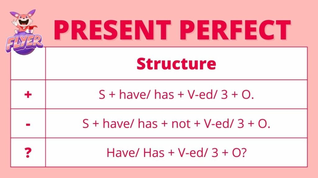– Hiện tại hoàn thành: S + have/ has + V-ed/ 3 + O.