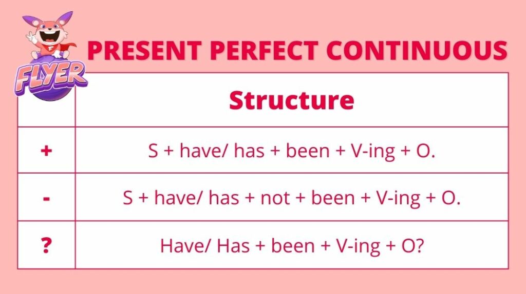 – Hiện tại hoàn thành tiếp diễn: S + have/ has + been + V-ing + O.