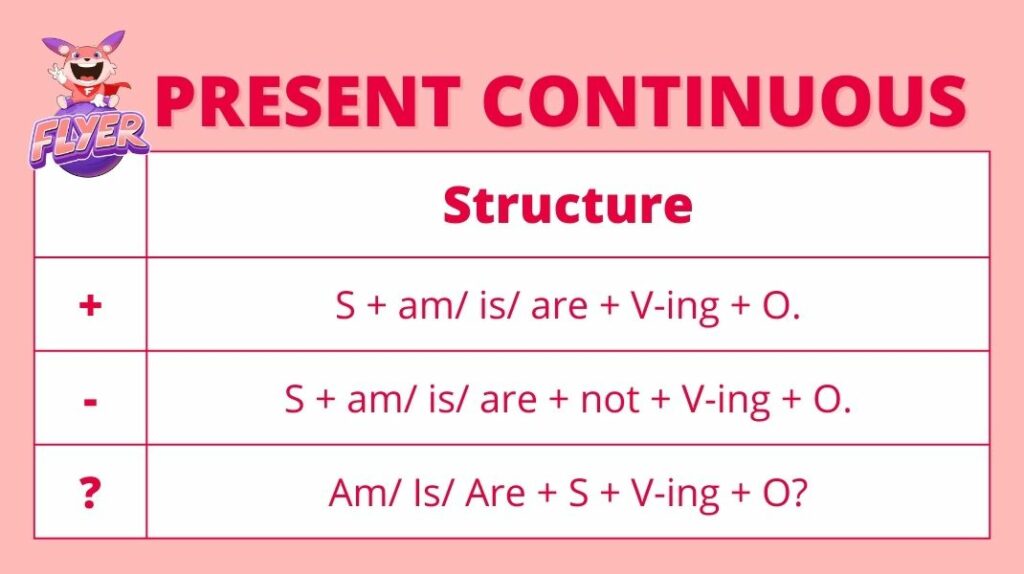 Cấu trúc tổng quát của các dạng tiếp diễn là “be + V-ing”. Với thì hiện tại tiếp diễn, bạn có cấu trúc chi tiết như sau:
