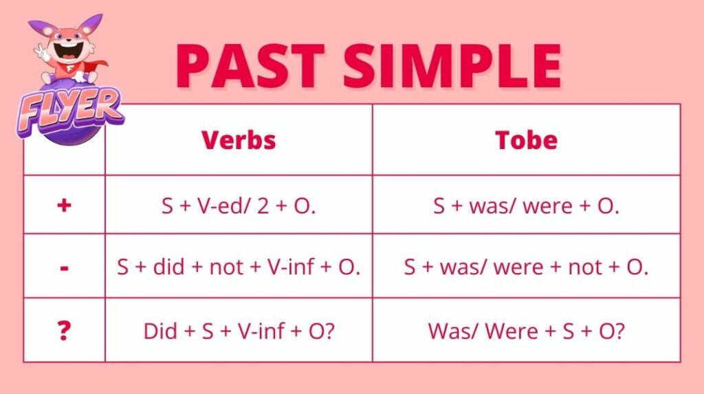 – Quá khứ đơn: S + V (-ed/was/were) + O.