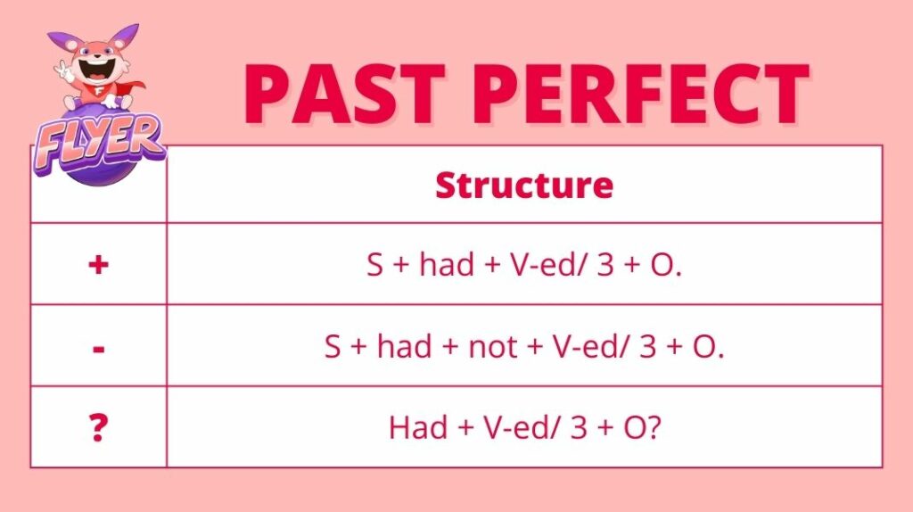 – Quá khứ hoàn thành: S + had + V (-ed/3) + O.