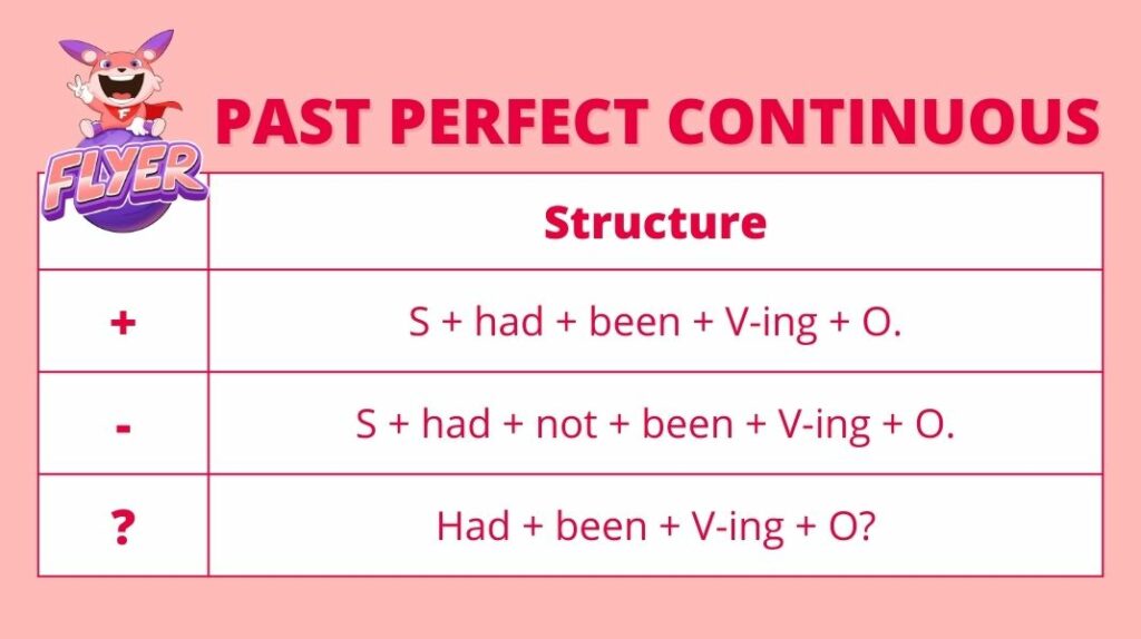 – Quá khứ hoàn thành tiếp diễn: S + had + been + V-ing + O.