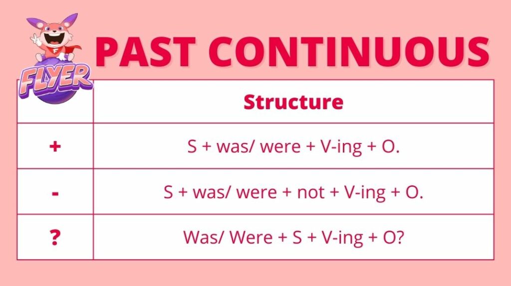 – Quá khứ tiếp diễn: S + was/ were + V-ing + O.