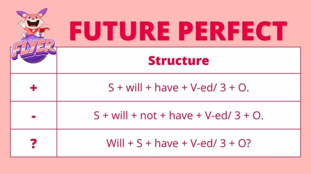 – Tương lai hoàn thành: S + will + have + V (-ed/3) + O.