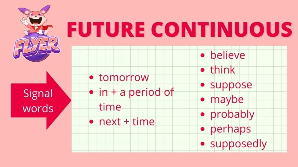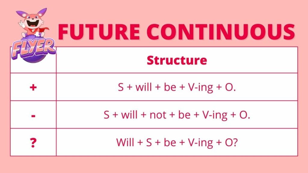 – Tương lai tiếp diễn: S + will + be + V-ing + O.
