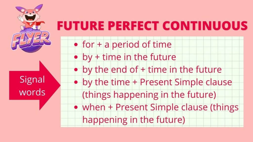 Thì tương lai hoàn thành tiếp diễn có một số dấu hiệu nhận biết tương đồng với thì tương lai hoàn thành. Ngoài ra, trong thì tương lai hoàn thành tiếp diễn, cụm từ “for + một khoảng thời gian” thường được thêm vào trước các dấu hiệu này để nhấn mạnh tính liên tục của sự việc, hành động. Cụ thể: