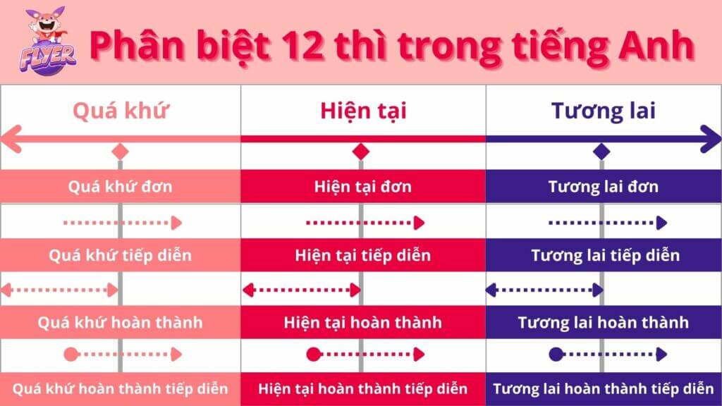 Trong bài viết dưới đây, FLYER sẽ tổng hợp toàn bộ kiến thức của 12 thì trong tiếng Anh một cách ngắn gọn nhất, dấu hiệu nhận biết các thì, đồng thời mách nhỏ cho bạn bí quyết để ghi nhớ các kiến thức này thật hiệu quả. Cùng kéo xuống và tìm hiểu ngay bạn nhé!