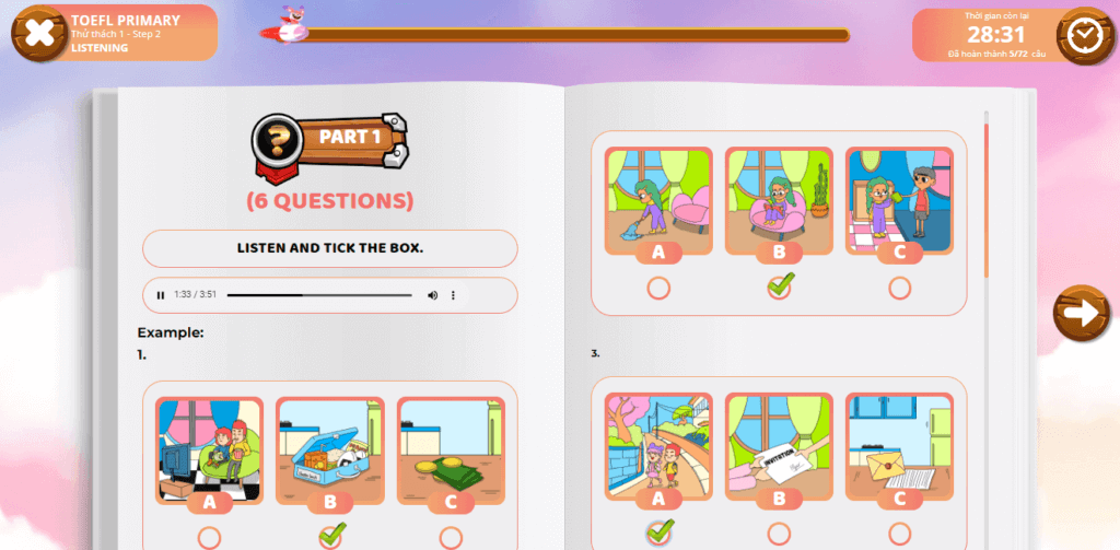- Các bài thi đều được thiết kế sao cho việc học tiếng Anh trở nên thú vị hơn, mang lại cho trẻ động lực và thái độ tích cực trong việc học tiếng Anh