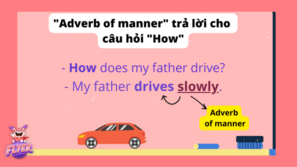 | slowly (một cách) chậm rãi | My father drives slowly. Bố tôi lái xe (một cách) chậm rãi. | How does my father drive? Bố tôi lái xe như thế nào? |