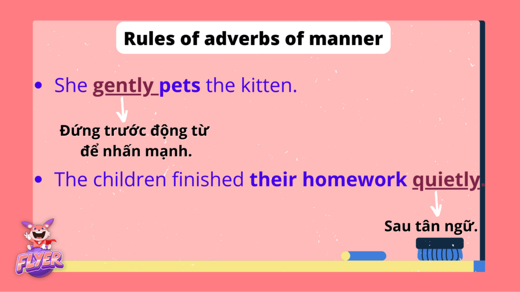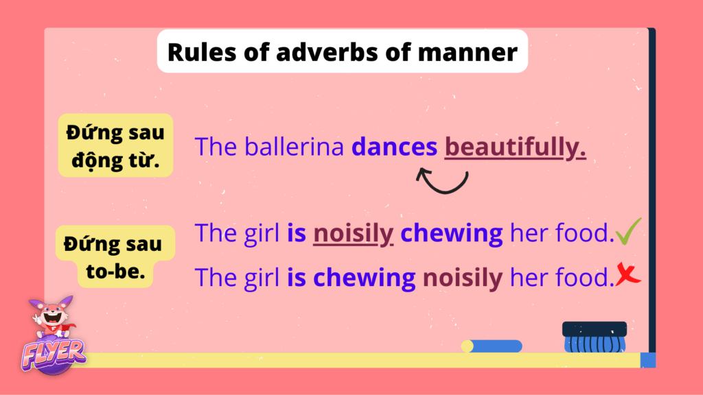 Vị trí trạng từ cách thức thường xuyên xuất hiện là đứng sau động từ chính của câu. Bạn chỉ nên thay đổi vị trí của trạng từ cách thức nếu đã nắm rõ quy luật ngữ pháp. (Xem kỹ phần 4)