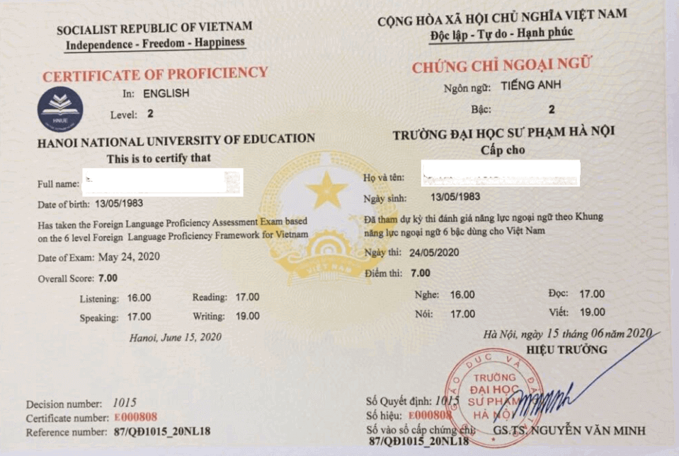 - Chứng chỉ tiếng Anh Sơ cấp Bậc 2 theo Khung năng lực ngoại ngữ Việt Nam Vstep (có giá trị 2 năm). Bạn có thể liên hệ một trong số các trường đại học được phép cấp chứng chỉ như Trường Đại học Ngoại ngữ – Đại học Quốc gia Hà Nội, Trường Đại học Ngoại ngữ – Đại học Huế, Trường Đại học Ngoại ngữ – Đại học Đà Nẵng, Trường Đại học Sư phạm Thành phố Hồ Chí Minh, Đại học Thái Nguyên, Đại học Sư phạm Hà Nội v.v.