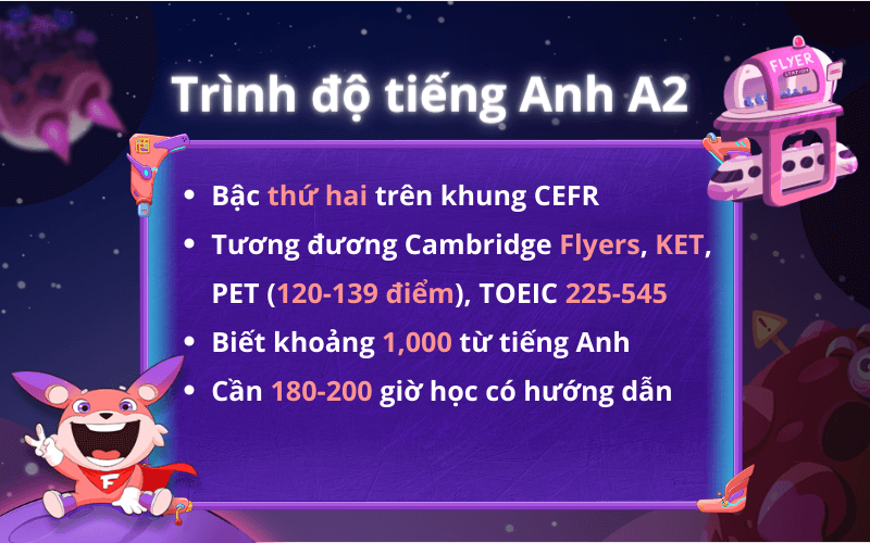 - Trình độ A2 tương đương với cấp độ tiếng Anh Cambridge Flyers, KET Cambridge Pass và Pass with Merit 120-139 điểm, PET Cambridge 120-139 điểm, TOEIC 225-545